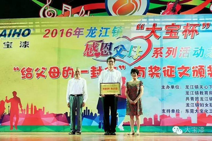 5月20日,由佛山龍江鎮教育局、龍江鎮關心下一代委員會與大寶漆共同主辦的2016年龍江鎮“大寶杯”感恩父母系列活動之“給父母的一封信”有獎征文頒獎典禮在龍江鎮城區中心小學舉辦。佛山龍江鎮教育局和龍江鎮關心下一代委員會在頒獎典禮上授予大寶漆“博愛慈懷熱心公益”稱號。大寶化工企劃部楊忠榮副理、龍江鎮關心下一代工作委員會麥煥橋主任、獲獎小學生及其家長出席了本次頒獎典禮。