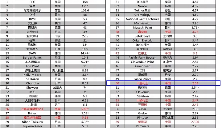 近日,美國《涂料世界》(Coatings World)雜志發布了2019年全球頂級涂料制造企業排行榜。本次上榜共82家公司,入圍門檻為2018年銷售額超過1億美元。榜單是基于涂料業務年銷售額(以美元計)排名。知名涂料品牌大寶漆,此次再次上榜,位列第50名。這已經是大寶漆連續多年登上該排行榜。