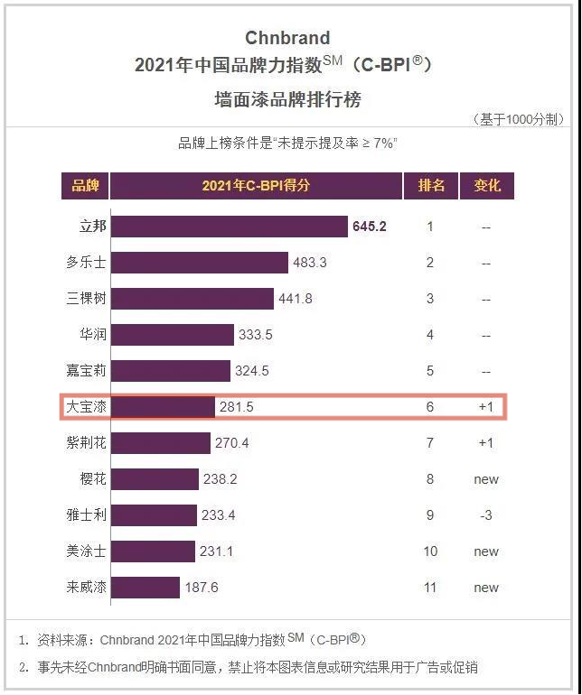 4月20日,國內品牌評級權威機構Chnbrand發(fā)布2021年(第十一屆)中國品牌力指數SM(C-BPI®)品牌排名和分析報告,大寶漆再次入榜。