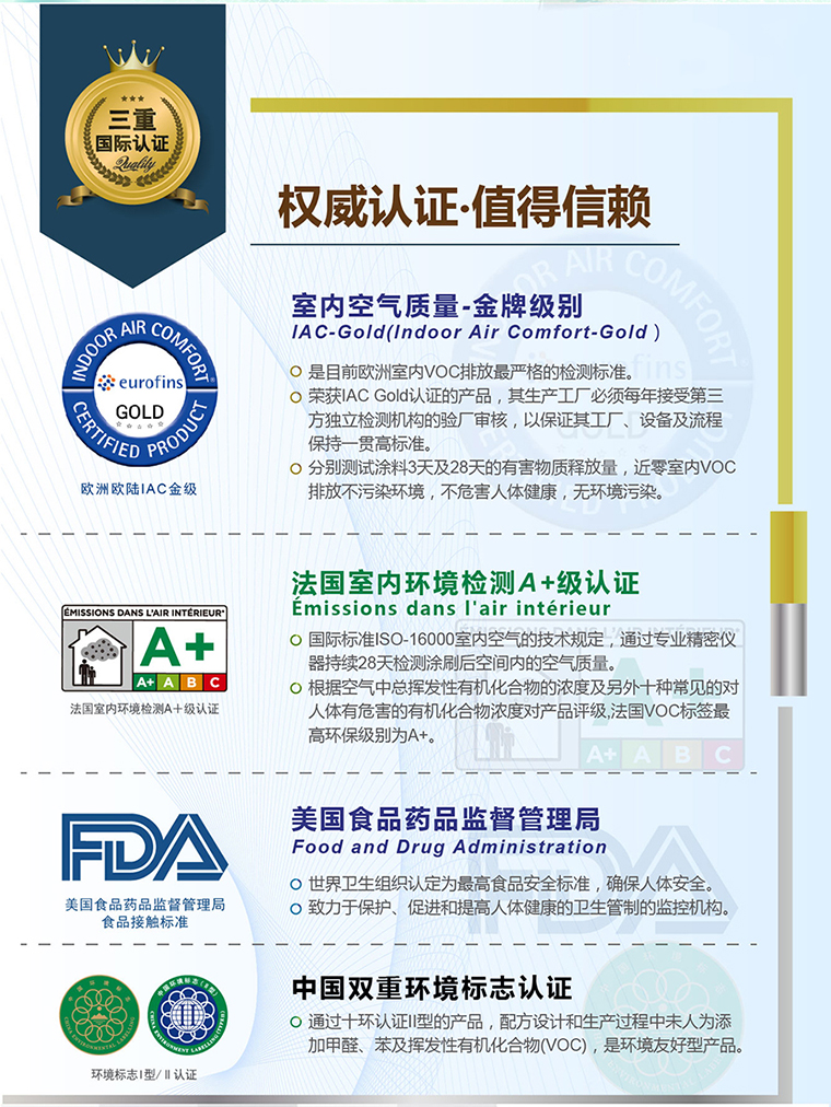 大寶零純+植物抗菌墻面漆取得歐陸歐陸IAC金級、法國A+、美國FDA得三重國際認(rèn)證;中國環(huán)境標(biāo)志認(rèn)證,及24小時室內(nèi)空氣質(zhì)量檢測達(dá)到法國A+級環(huán)保檢測,為有快速入住需求的消費(fèi)群體提供高環(huán)保性能,產(chǎn)品無憂之選。