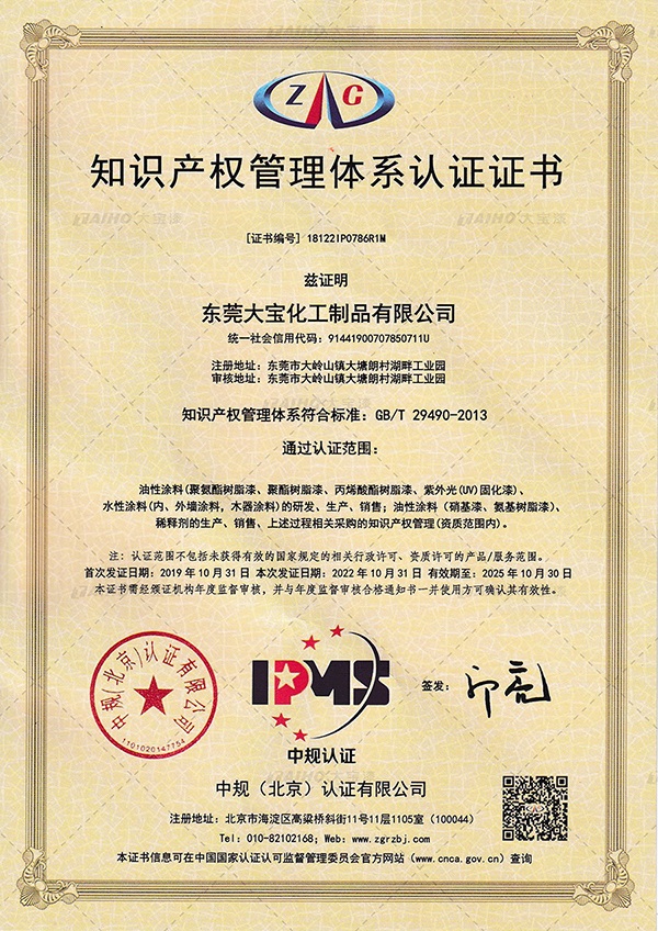 4月26日,是第23個(gè)世界知識產(chǎn)權(quán)日,大寶化工再次通過國家企業(yè)知識產(chǎn)權(quán)管理認(rèn)證,是對大寶化工近年來取得創(chuàng)新成果的肯定,同時(shí)也標(biāo)志著大寶漆在知識產(chǎn)權(quán)創(chuàng)造、運(yùn)用、管理和保護(hù)方面具備領(lǐng)先水平。