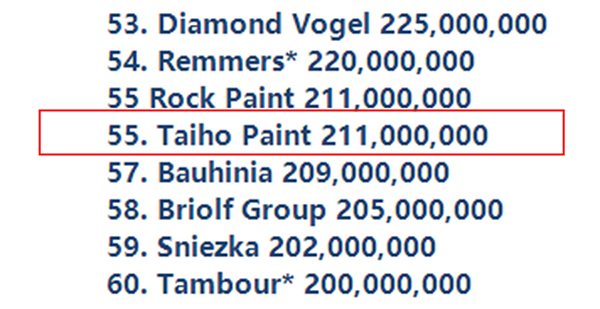 近日,美國《涂料世界》(Coatings World)雜志發(fā)布了2023年全球頂級(jí)涂料企業(yè)排行榜,全球73家涂料企業(yè)上榜,作為民族涂料品牌,大寶漆連續(xù)多年登上該排行榜,位列第55名。