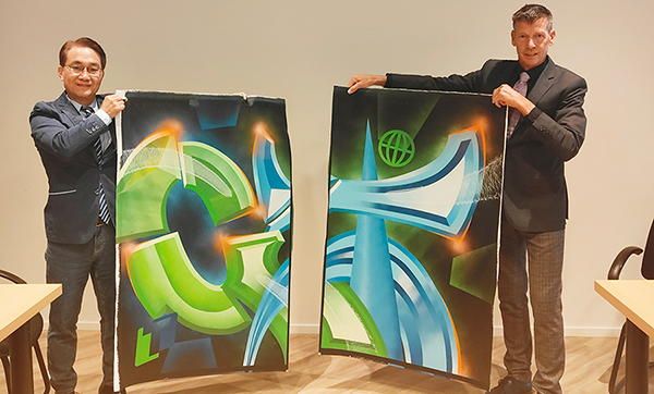 此次簽約儀式別具創意與情感意義,高樂伯總裁Kees特別邀請當地知名畫家以“G”與“T”兩個字母為主題,分別代表Global Paint與Taiho Paint,創作一幅融合東西方藝術語匯的油畫作品。簽約當日,雙方代表共同剪下畫作中央,各自保留一半,象征兩家企業跨越地域、文化的深度連結。