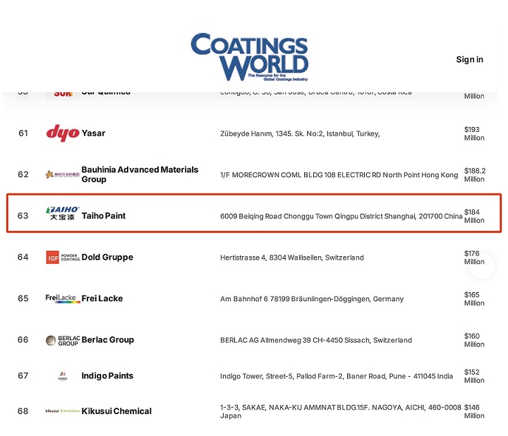 Coatings World《涂料世界》的全球涂料企業排行榜是業界公認的國際化權威榜單,客觀反映了全球涂料行業的發展格局與企業競爭力。此次上榜,彰顯了大寶漆在技術研發、環保創新及市場服務等方面的綜合實力。